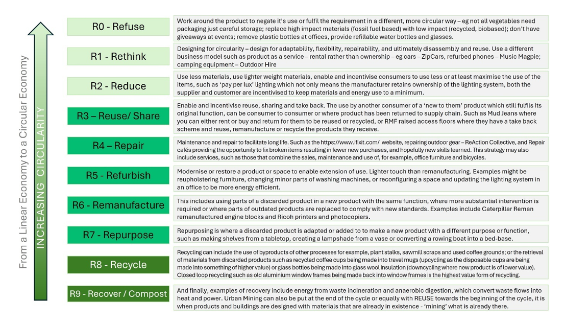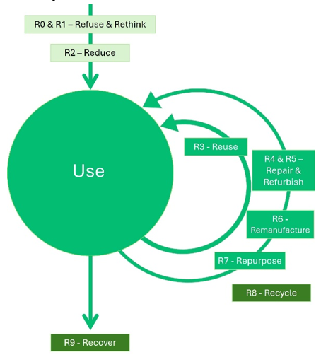 The circular economy ‘R ladder’ can be shown in different ways, as the table with examples above or as below demonstrating the way materials loop around a circular system.
