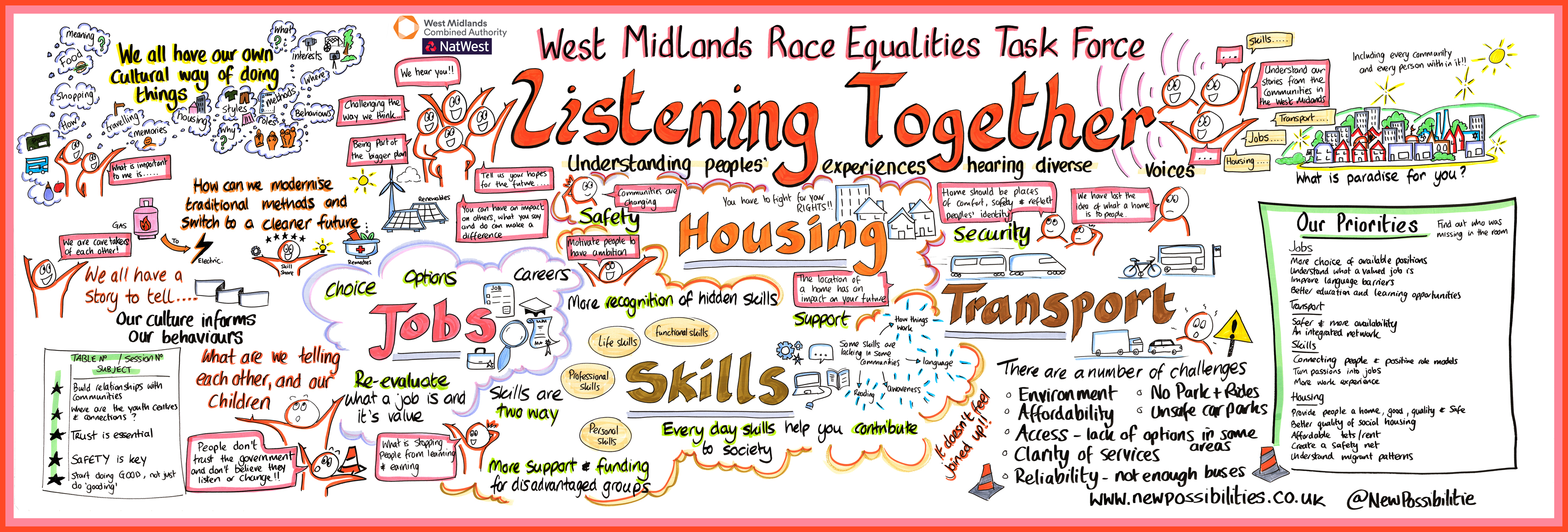 The Taskforce held our first community event on 11 November, which saw more than 70 people take part in conversations about jobs, skills, housing and transport in the West Midlands. These insights and lived experiences have shaped this strategy. The event was delivered in partnership with Alleyne& and hosted by NatWest. You can read the insights in the Listening Together report.